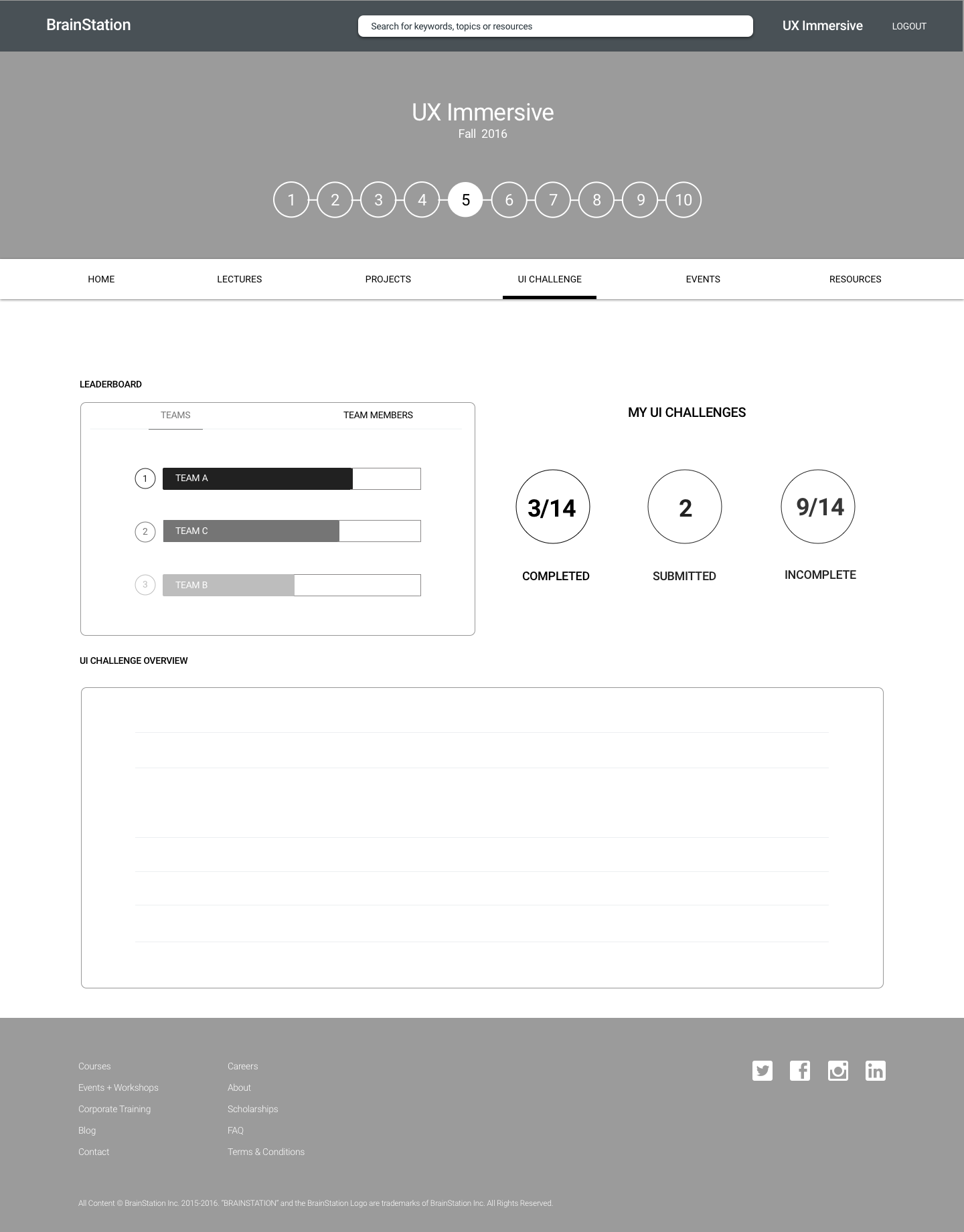 A design feature to help students track UI challenges will keep students engaged with class material. A simplified way to view all the challenges to be completed, how many have been completed individually and which team is leading will aid to create higher importance to complete all optional challenges throughout the course.